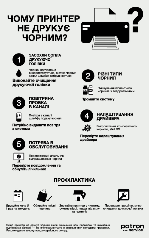 Розповсюджена причина відсутності чорного друку — засохле чорнило в соплах. Це особливо актуально, якщо пристрій довго не використовувався.