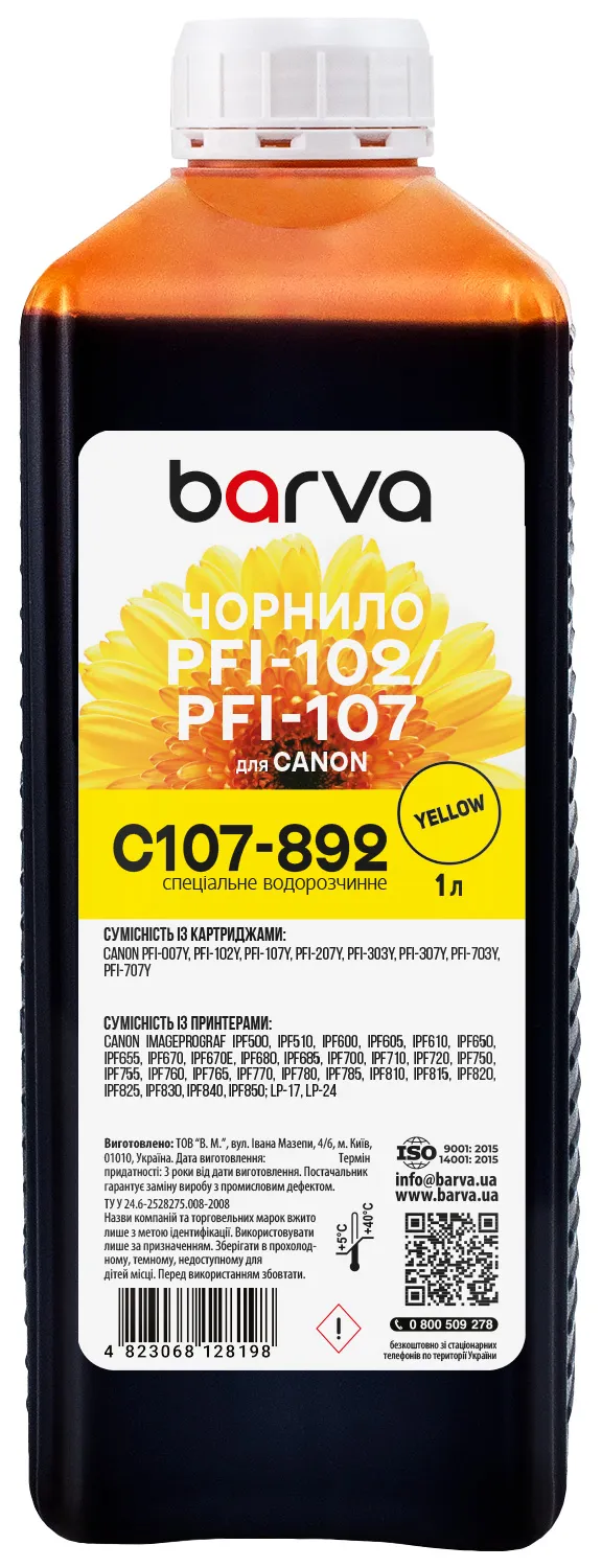 - Чорнило для Canon PFI-102/PFI-107 Y спеціальне 1 л, водорозчинне, жовте Barva (C107-892)