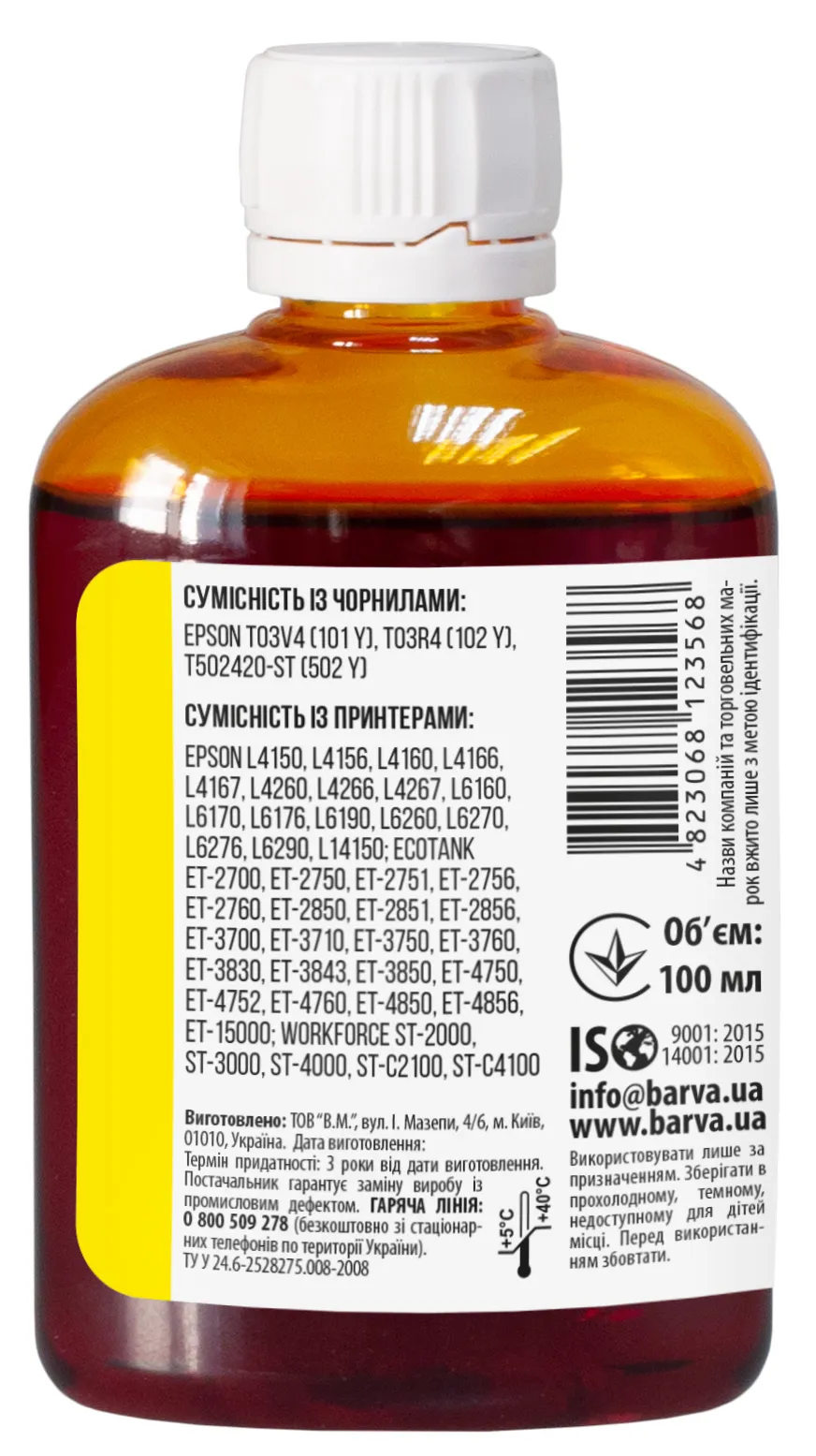Чорнило сумісне для Epson 101 Y спеціальне 100 мл, водорозчинне, жовте Barva (E101-601) опис: