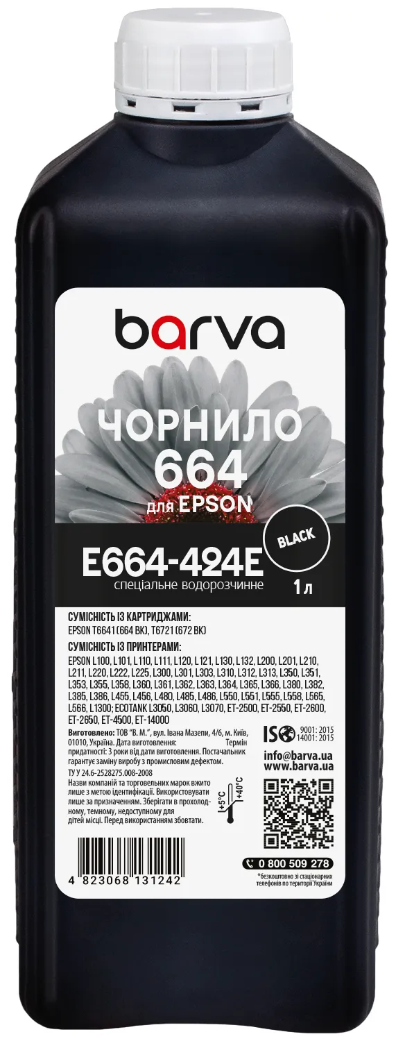 Чорнило для Epson 664 BK спеціальне 1 л, водорозчинне, чорне Barva (E664-424e) опис: