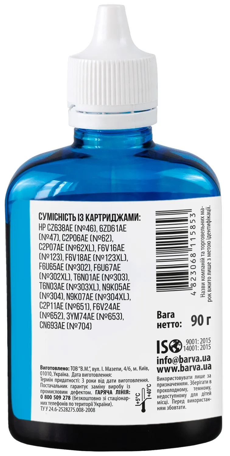 - Чорнило для HP 46/123/651/652 спеціальне 90 г, водорозчинне, блакитне Barva (H652-532)