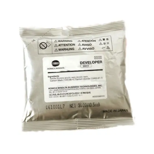Девелопер використовується в деяких моделях друкуючих пристроїв, які мають двокомпонентний вид блоку проявки. За допомогою девелопера відбувається перенос тонеру до фотобарабану. Девелопер DV-411 Konica Minolta (A202550) може бути використаний в пристроях торговельної марки Konica Minolta, вказаних у сумісності.