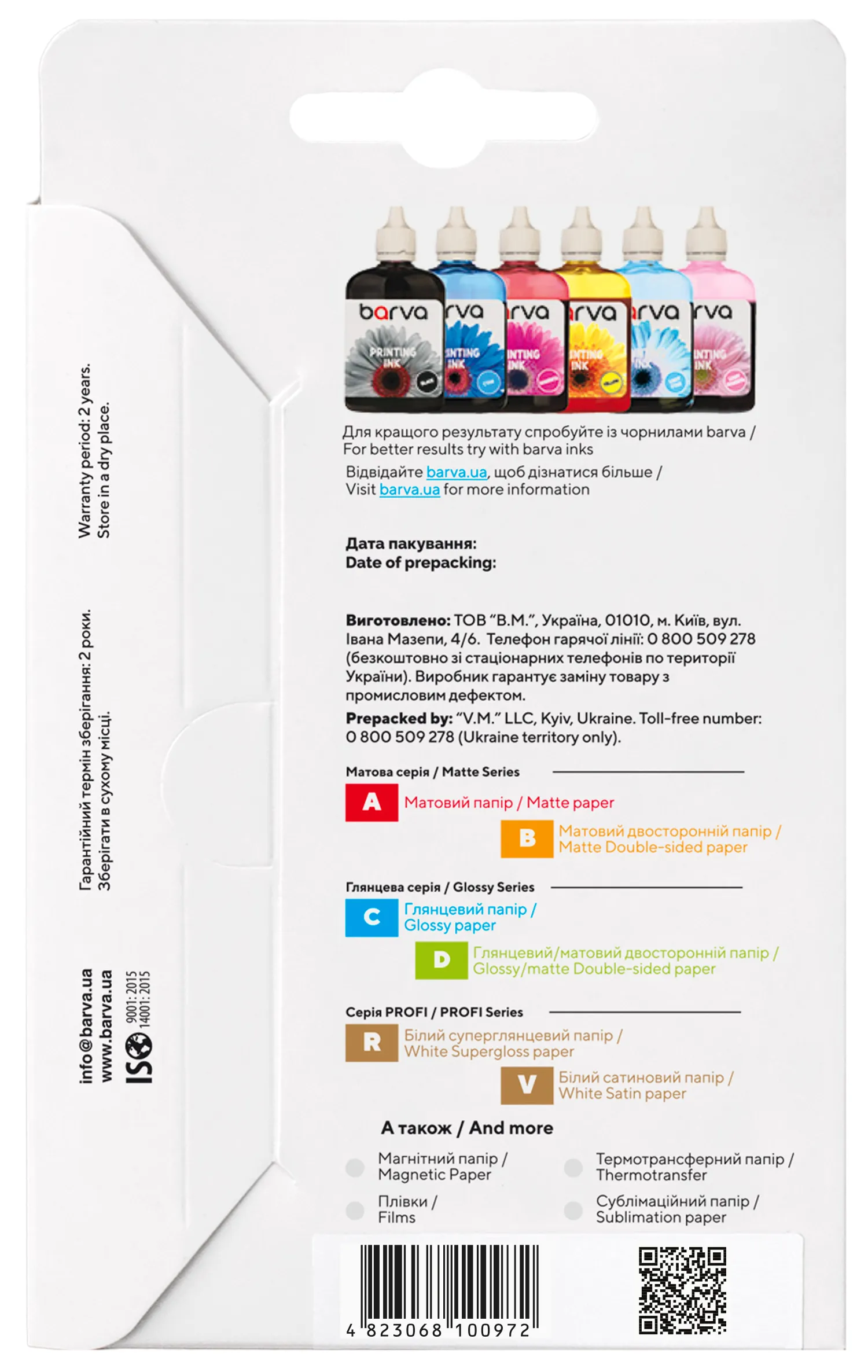 Під торговою маркою Barva на ринок виходить широкий асортимент матеріалів для струменевого друку, який допоможе Вам з виконанням різних завдань - від друку фотографій, до виготовлення рекламних і маркетингових матеріалів. Носії для струминного друку під цією торговою маркою випускаються на ринок українською компанією ТОВ «В. М. » з 2003 року і вже встигли завоювати довіру користувачів незмінно високою якістю та доступними цінами.