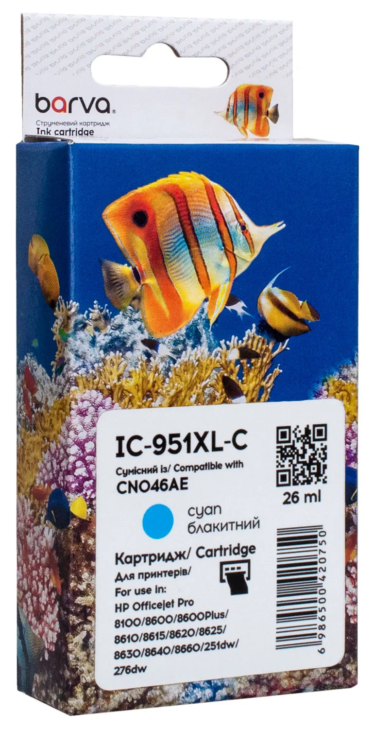 Картридж сумісний HP 951XL (CN046AE/CN050AE) 1500 арк, блакитний Barva (IC-951XL-C), опис: