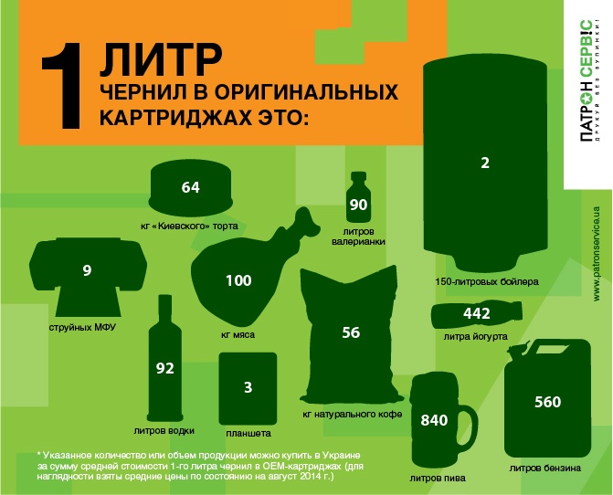 В Украине за сумму средней стоимости 1-го литра чернил в ОЕМ-картриджах можно купить указанное количество или объем продукции (для наглядности взяты средние цены по состоянию на август 2014г):