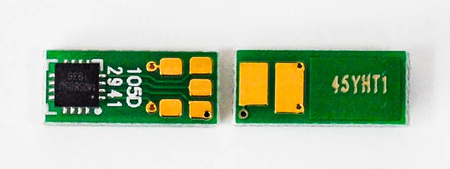 Что такое чип для картриджа? Это небольшая по размеру микросхема, в которую вшита информация о ресурсе самого картриджа, обеспечен функцией обмена данными с принтером. Проще говоря, благодаря чипу аппарат может посчитать количество отпечатанных страниц. В момент, когда счётчик страниц подошел к концу, вы увидите предупреждение о том, что картридж закончился и его необходимо заменить, даже если в бункере картриджа остался неиспользованный тонер.