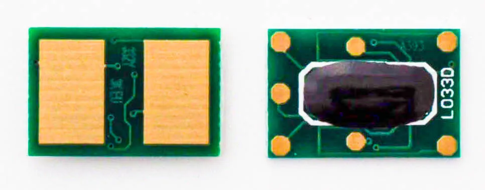 Что такое чип для картриджа? Это небольшая по размеру микросхема, в которую вшита информация о ресурсе самого картриджа, обеспечен функцией обмена данными с принтером. Проще говоря, благодаря чипу аппарат может посчитать количество отпечатанных страниц. В момент, когда счётчик страниц подошел к концу, вы увидите предупреждение о том, что картридж закончился и его необходимо заменить, даже если в бункере картриджа остался неиспользованный тонер.