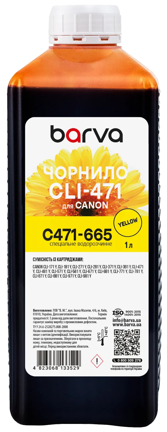 - Чернила для Canon CLI-471/CLI-481 Y специальные 1 л, водорастворимые, желтые Barva (C471-665)
