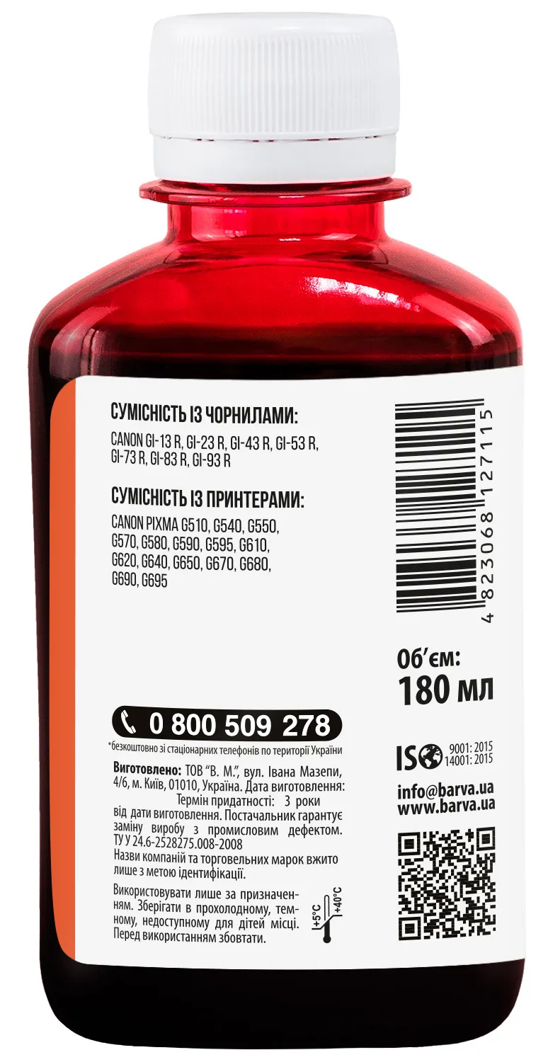 Украинская компания ООО «В.М.» занимается производством чернил под торговой маркой Barva уже много лет. На базе собственной лаборатории осуществляется как разработка новых формул, так и непрерывный контроль качества выпускаемой продукции. При производстве чернил производитель следует стандартам ISO 9001:2015 и ISO 14001:2015.