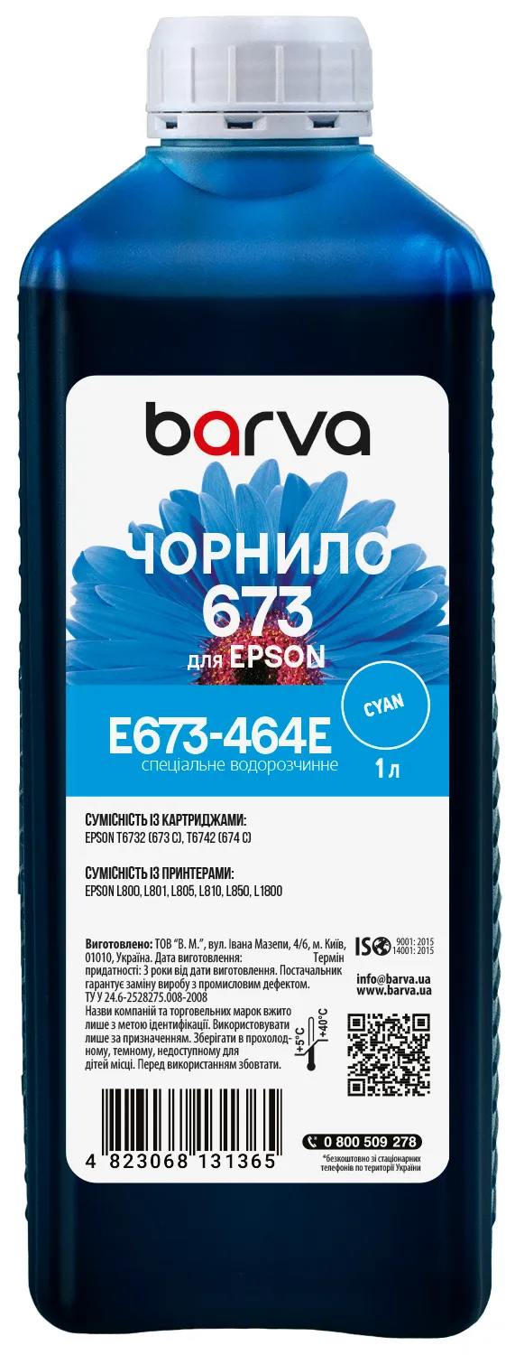 - Чернила для Epson 673 C специальные 1 л, водорастворимые, голубые Barva (E673-464e)