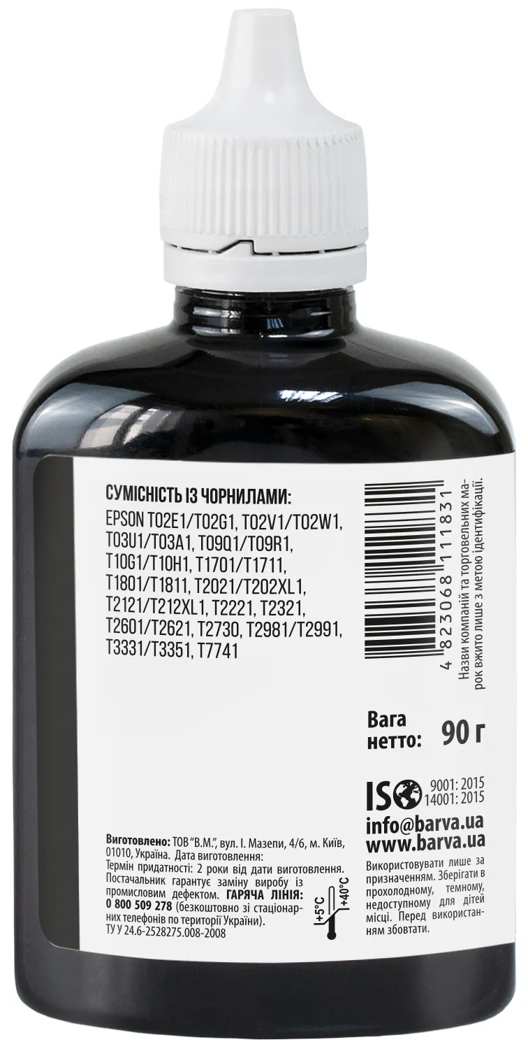 Украинская компания ООО «В.М.» занимается производством чернил под торговой маркой Barva уже много лет. На базе собственной лаборатории осуществляется как разработка новых формул, так и непрерывный контроль качества выпускаемой продукции. При производстве чернил производитель следует стандартам ISO 9001:2015 и ISO 14001:2015.