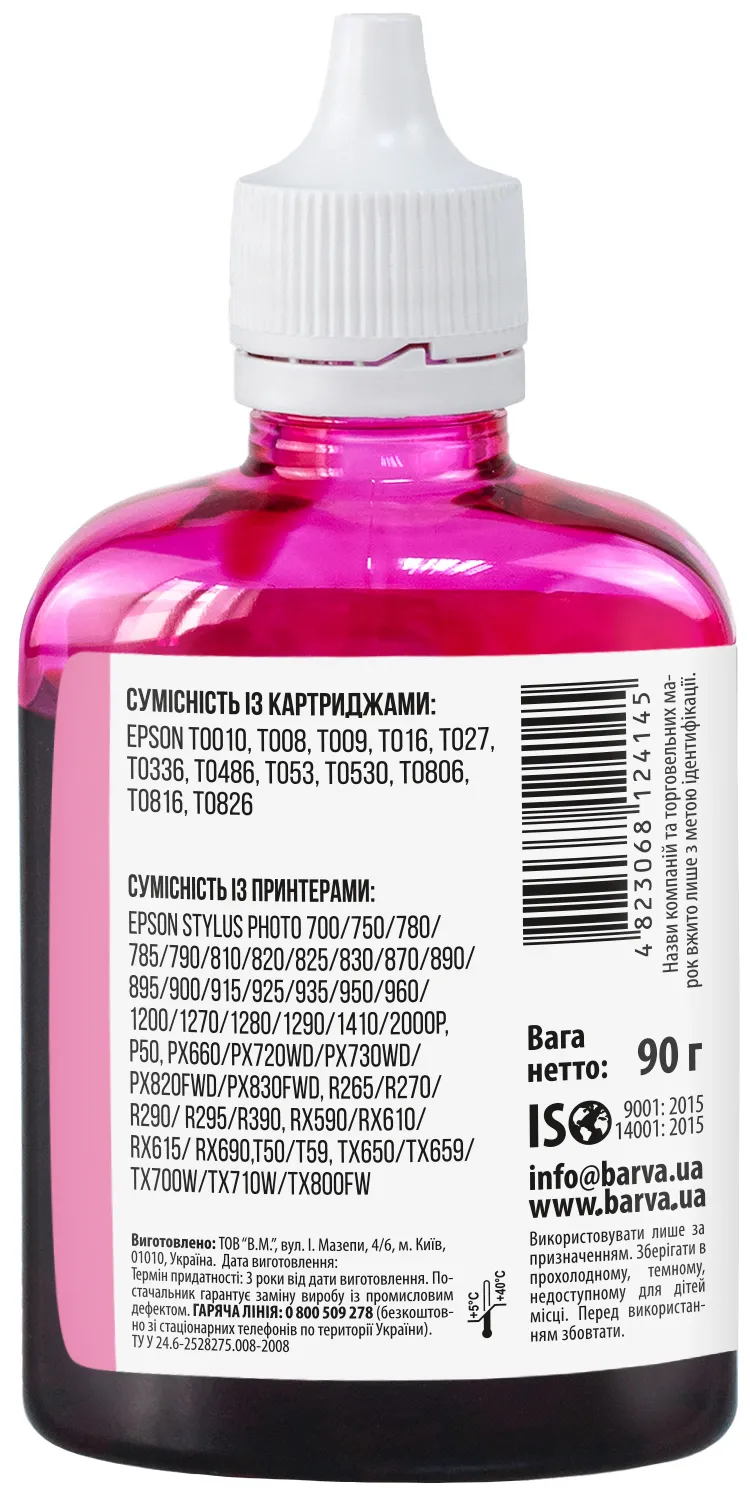 Украинская компания ООО «В.М.» занимается производством чернил под торговой маркой Barva уже много лет. На базе собственной лаборатории осуществляется как разработка новых формул, так и непрерывный контроль качества выпускаемой продукции. При производстве чернил производитель следует стандартам ISO 9001:2015 и ISO 14001:2015.