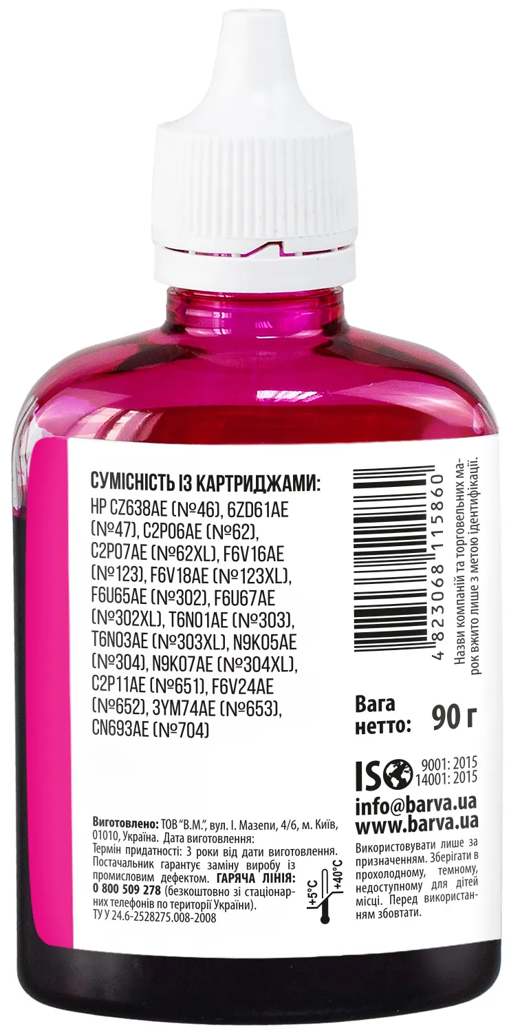 Украинская компания ООО «В.М.» занимается производством чернил под торговой маркой Barva уже много лет. На базе собственной лаборатории осуществляется как разработка новых формул, так и непрерывный контроль качества выпускаемой продукции. При производстве чернил производитель следует стандартам ISO 9001:2015 и ISO 14001:2015.