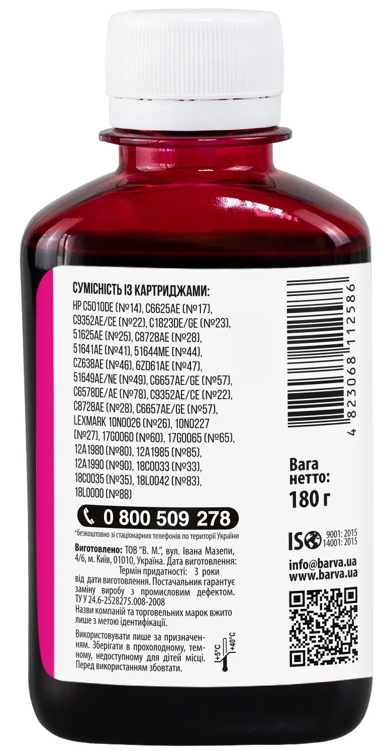 Украинская компания ООО «В.М.» занимается производством чернил под торговой маркой Barva уже много лет. На базе собственной лаборатории осуществляется как разработка новых формул, так и непрерывный контроль качества выпускаемой продукции. При производстве чернил производитель следует стандартам ISO 9001:2015 и ISO 14001:2015.
