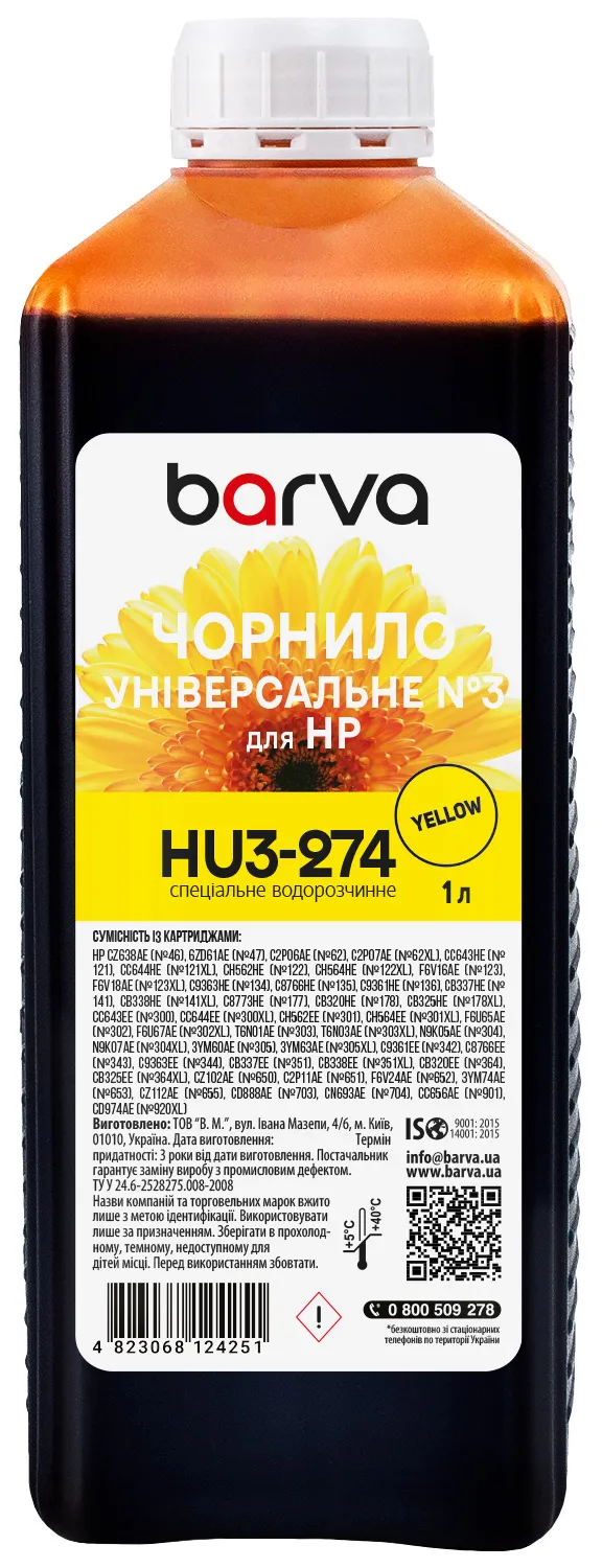 Чернила для HP универсальные №3 1 л, водорастворимые, желтые Barva (HU3-274) - лучший выбор на сайте patronservice.ua