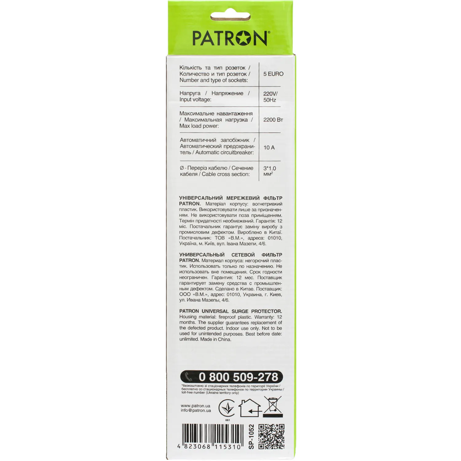 Корпус фильтра Patron выполнен из прочного негорючего пластика и имеет отверстия для крепления на стену. Кабель сетевого фильтра имеет сечение 3*1.0 мм, что позволяет стабильно работать при высоких нагрузках и не перегреваться.