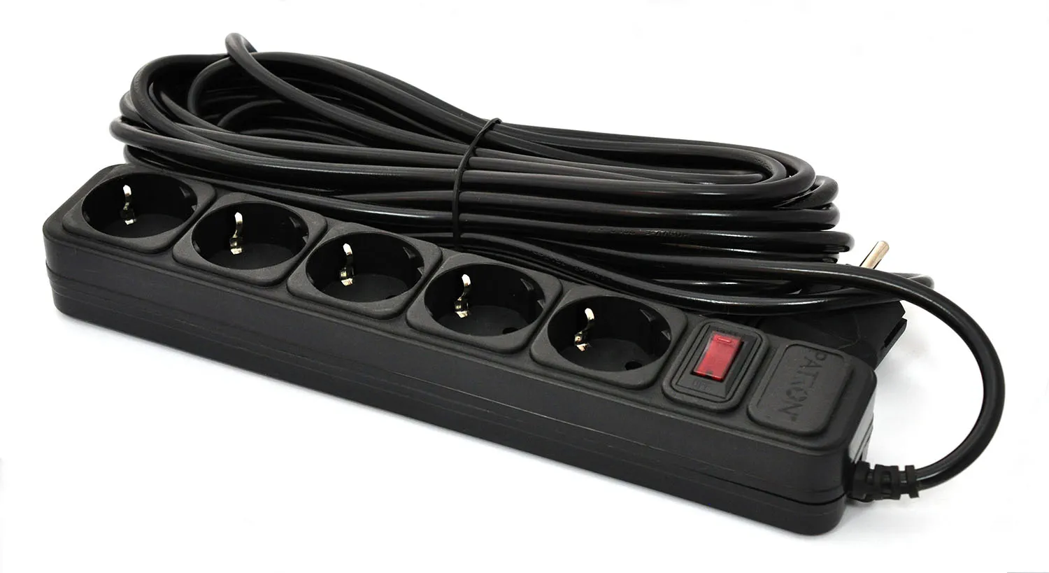- Фильтр сетевой 5 розеток, 10 м, черный, 3*1мм2 Patron (SP-10510)