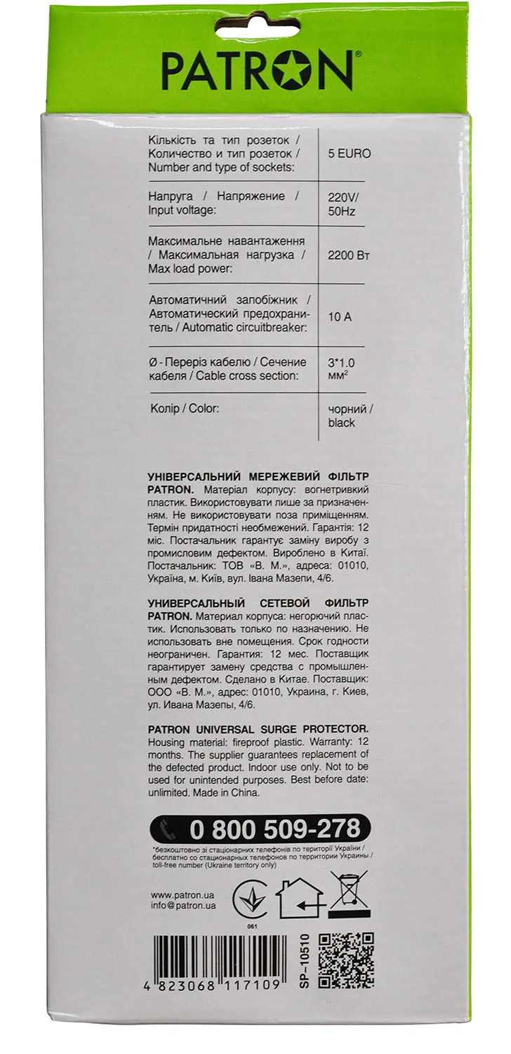 Корпус фильтра Patron выполнен из прочного негорючего пластика и имеет отверстия для крепления на стену. Кабель сетевого фильтра имеет сечение 3*1.0 мм, что позволяет стабильно работать при высоких нагрузках и не перегреваться.