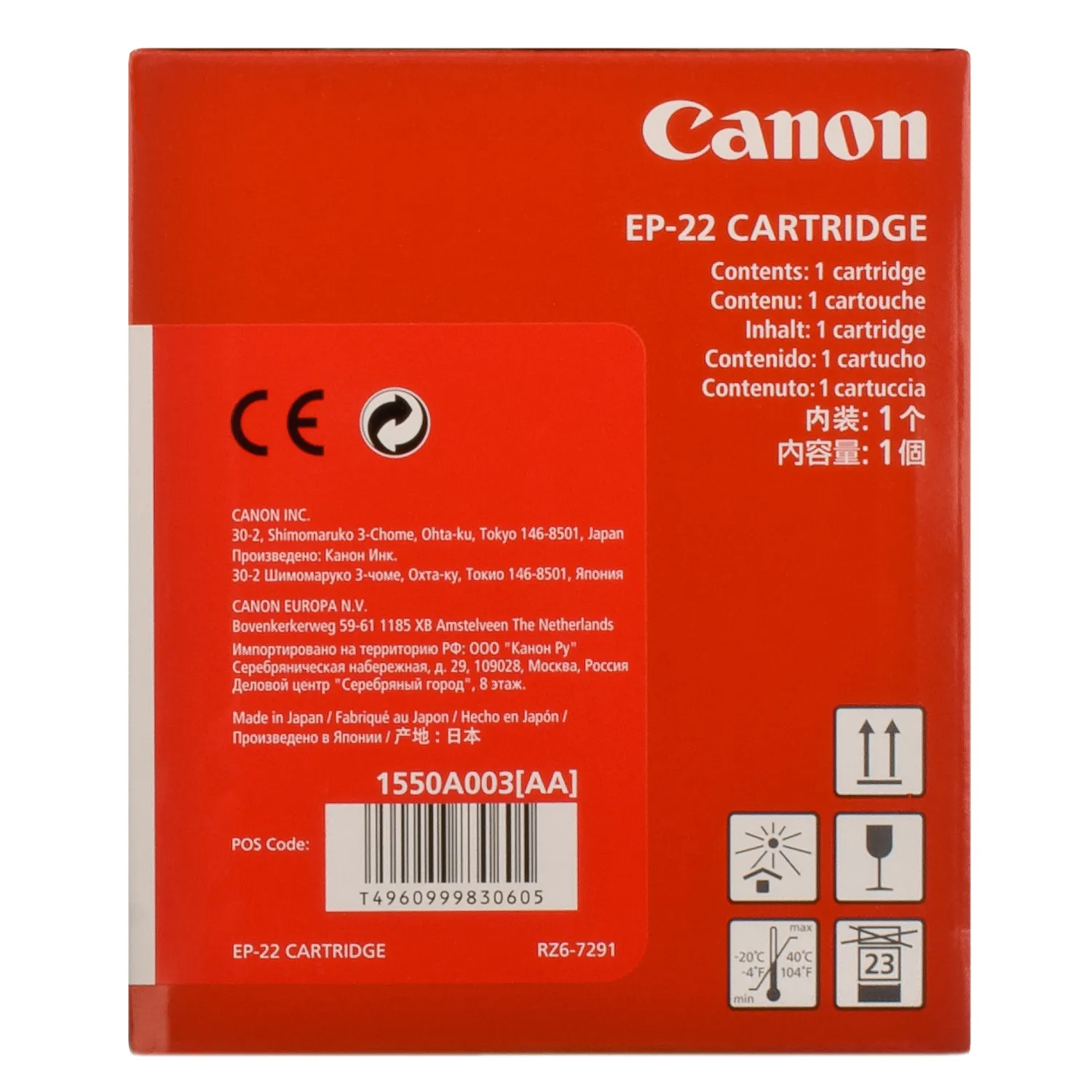 Оригинальный картридж EP-22 разработан компанией Canon, что является гарантией высокого качества и обеспечивает стабильную работу на протяжении всего ресурса – 2500 страниц. Картридж EP-22 Canon (1550A003) относится к группе оригинальных расходных материалов, единственным минусом которых является высокая стоимость.