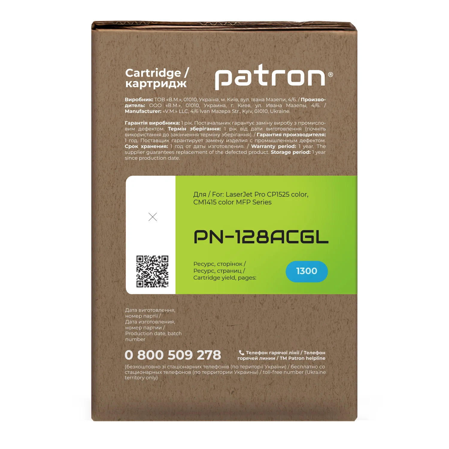 Мы позаботились о том, чтобы упаковка картриджа была не только экологичной, функциональной, имела минимально возможные физические размеры, но и содержала всю необходимую информацию. На зеленой этикетке находится информация о продукте, его совместимости с печатающими устройствами, номер партии, дата изготовления, контакты производителя, а также номер телефона бесплатной горячей линии для украинских потребителей.