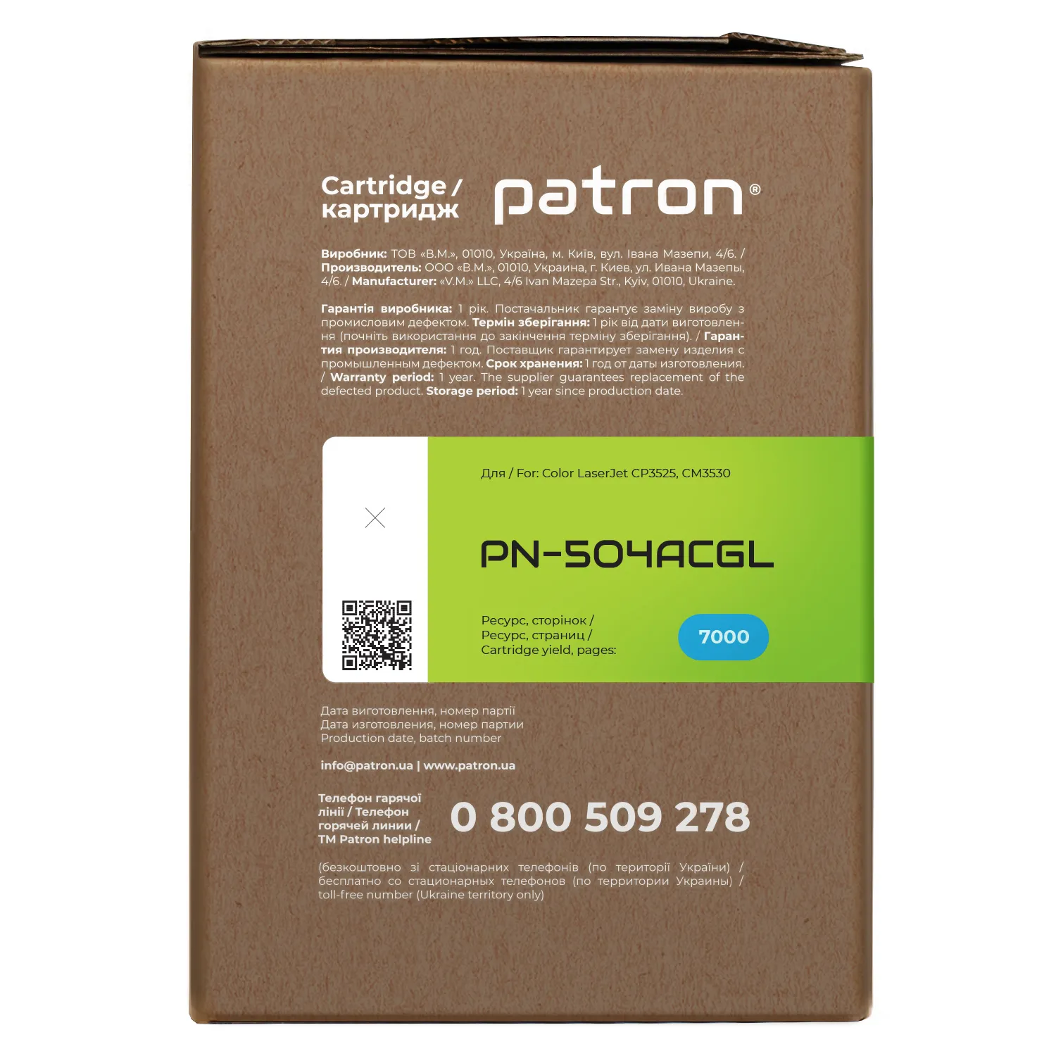 Мы позаботились о том, чтобы упаковка картриджа была не только экологичной, функциональной, имела минимально возможные физические размеры, но и содержала всю необходимую информацию. На зеленой этикетке находится информация о продукте, его совместимости с печатающими устройствами, номер партии, дата изготовления, контакты производителя, а также номер телефона бесплатной горячей линии для украинских потребителей.