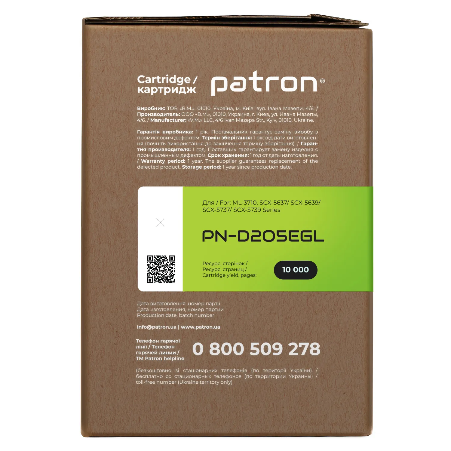 Мы позаботились о том, чтобы упаковка картриджа была не только экологичной, функциональной, имела минимально возможные физические размеры, но и содержала всю необходимую информацию. На зеленой этикетке находится информация о продукте, его совместимости с печатающими устройствами, номер партии, дата изготовления, контакты производителя, а также номер телефона бесплатной горячей линии для украинских потребителей.