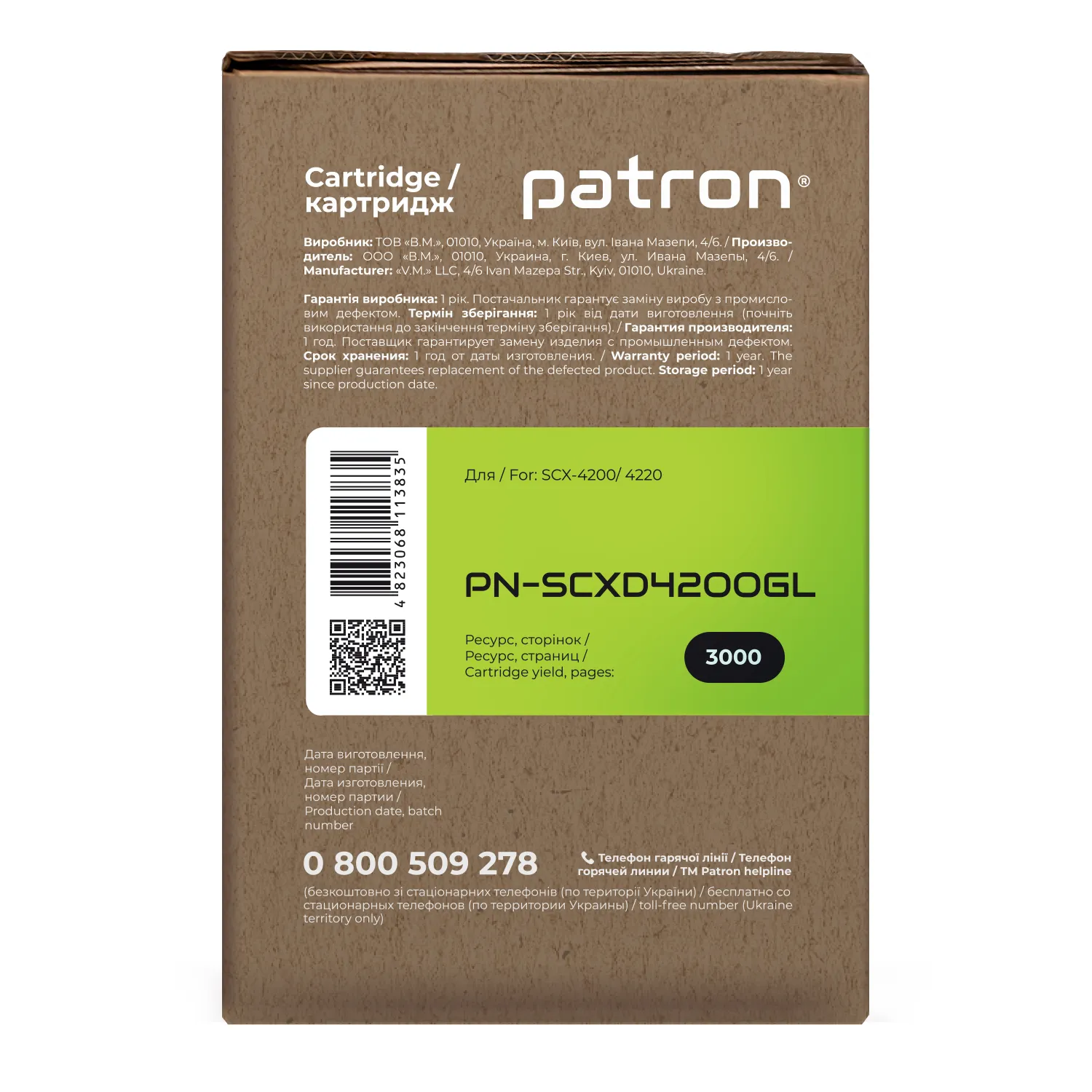 Мы позаботились о том, чтобы упаковка картриджа была не только экологичной, функциональной, имела минимально возможные физические размеры, но и содержала всю необходимую информацию. На зеленой этикетке находится информация о продукте, его совместимости с печатающими устройствами, номер партии, дата изготовления, контакты производителя, а также номер телефона бесплатной горячей линии для украинских потребителей.