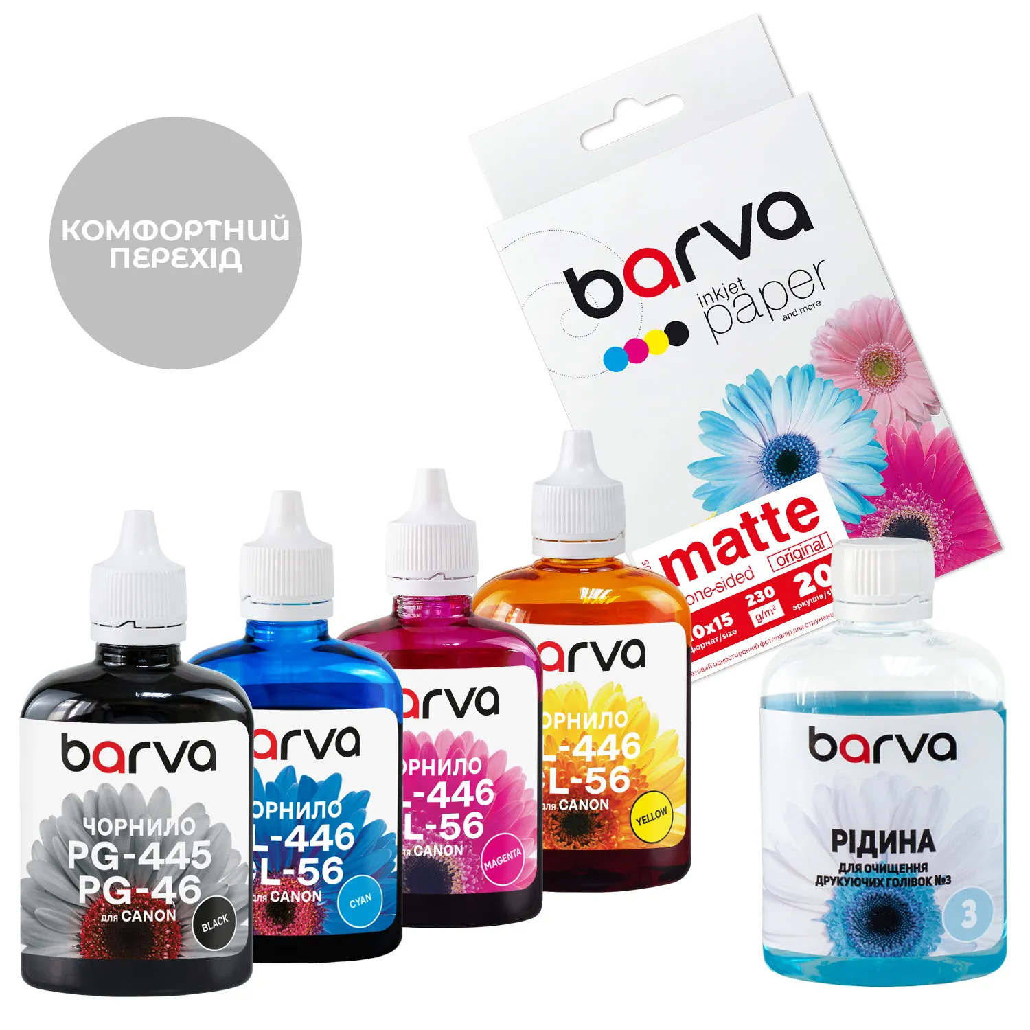 Комплект чернил совместимых "Комфортный переход" для Canon PG-445/CL-446 специальные 4х90 г + фотобумага 10х15 20 л + жидкость 90 г Barva (CPG445-CMP) - лучший выбор на сайте patronservice.ua