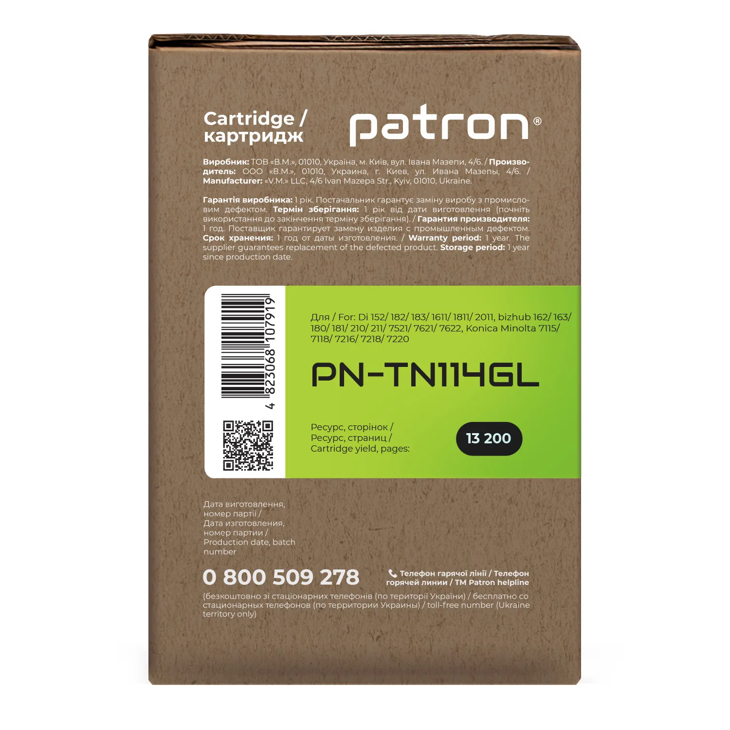 Мы позаботились о том, чтобы упаковка картриджа была не только экологичной, функциональной, имела минимально возможные физические размеры, но и содержала всю необходимую информацию. На зеленой этикетке находится информация о продукте, его совместимости с печатающими устройствами, номер партии, дата изготовления, контакты производителя, а также номер телефона бесплатной горячей линии для украинских потребителей.