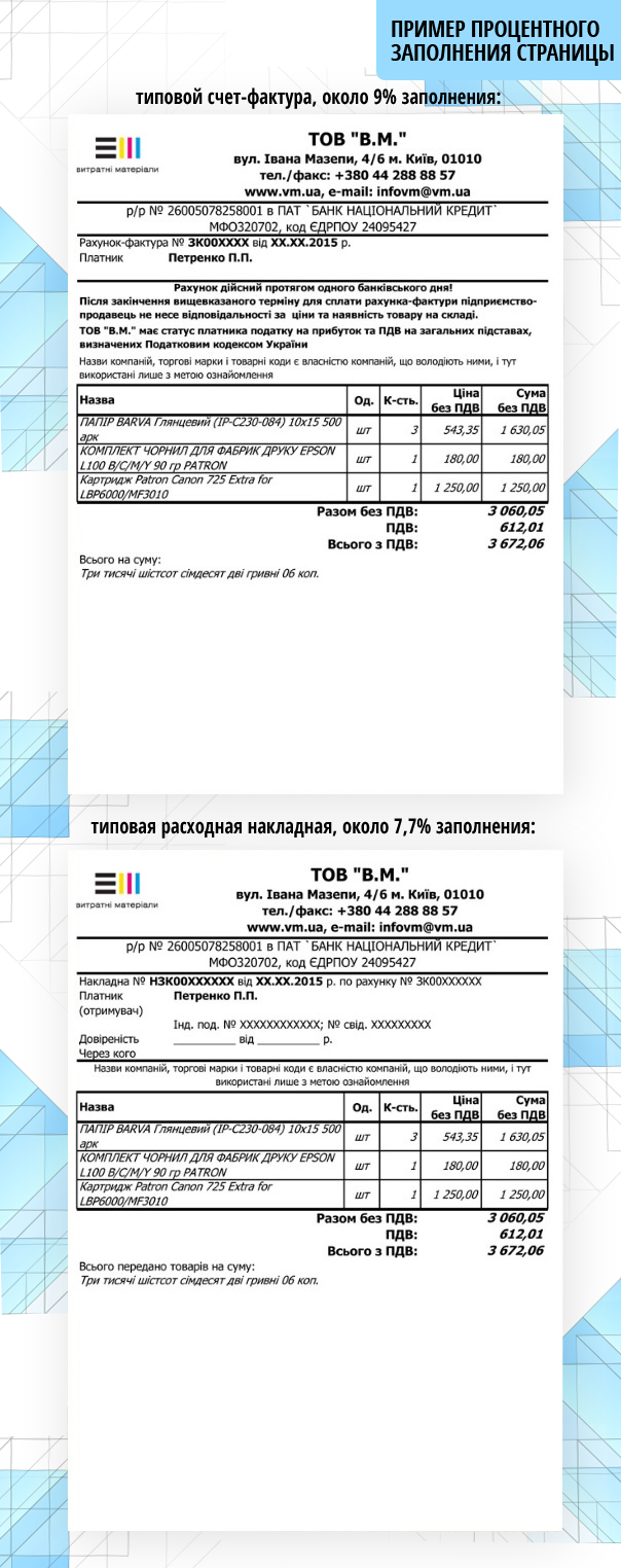 Часто на сайтах або в магазинах Ви можете побачити, що в характеристиках картриджа вказано ресурс друку, який вимірюється у кількості сторінок (найбільш поширені 1400 стор., 1600 стор., 1800 стор., 2100 стор., 2200 стор.). Виробники в характеристиках картриджа приводять його розрахунковий ресурс, у так званих сторінках з 5% заповненням. Що це таке? Це - злегка застарілий стандарт, заснований на аркуші, заповненому текстом, надрукованим на друкарській машинці, через 2 інтервали. Якщо ж подивитися на наші реалії, то типовий рахунок-фактура займає близько 9% а видаткова накладна близько 7,7%:
