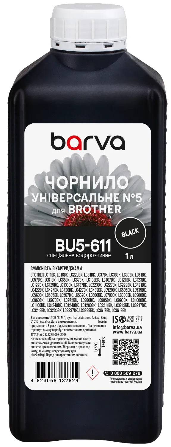 - Чорнило для Brother універсальне №5 1 л, водорозчинне, чорне Barva (BU5-611)