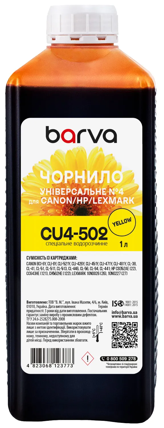 Чорнило для Canon/HP/Lexmark універсальне №4 1 л, водорозчинне, жовте Barva (CU4-502) опис:
