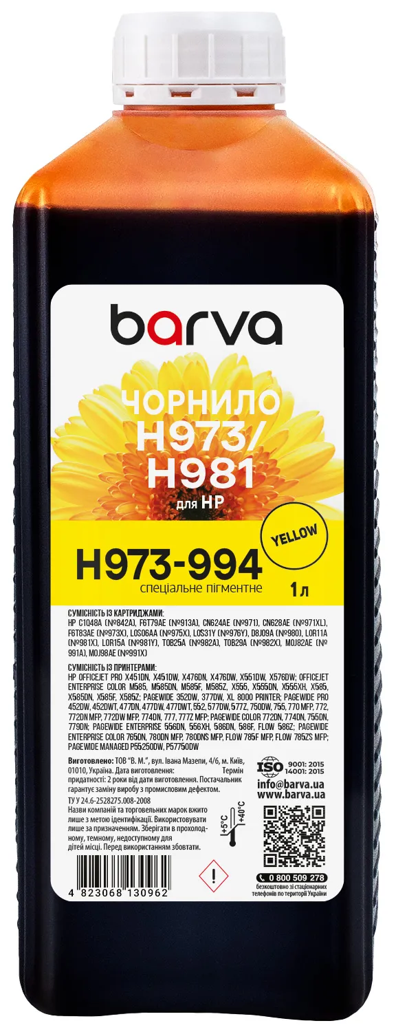 Чорнило для HP 971/973/981 спеціальне 1 л, пігментне, жовте Barva (H973-994) опис: