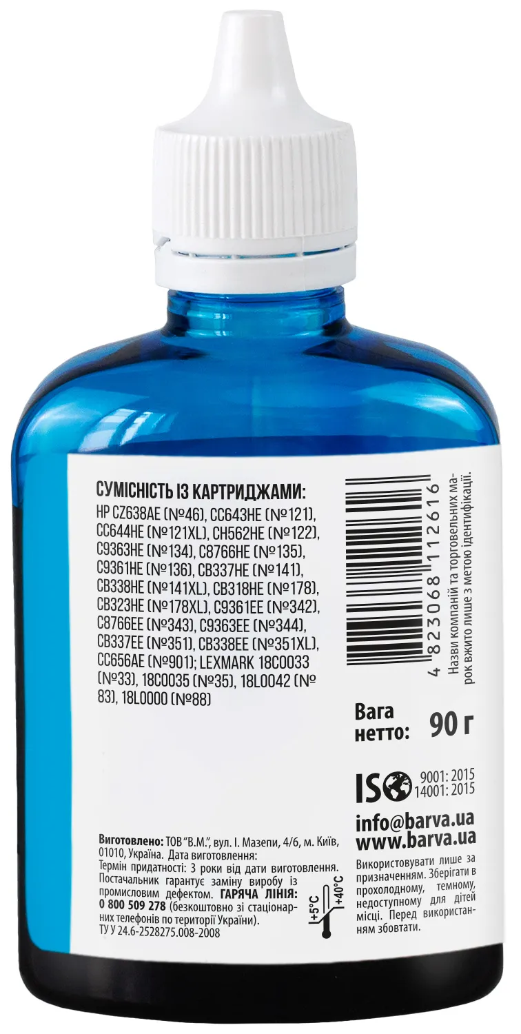 Українська компанія ТОВ «В.М.» займається виробництвом чорнил під торговою маркою Barva вже багато років. На базі власної лабораторії відбувається як розробка нових формул, так і неперервний контроль якості продукції, що випускається. При виробництві чорнил виробник слідує стандартам ISO 9001:2015 та ISO 14001:2015.