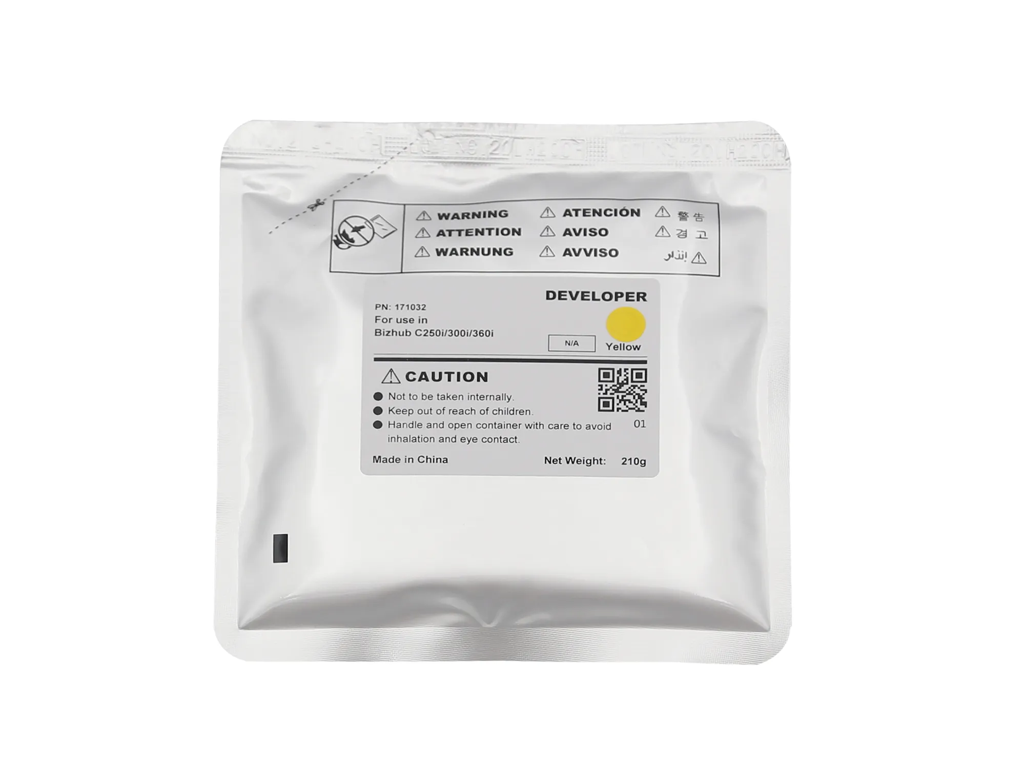 Девелопер використовується в деяких моделях друкуючих пристроїв, які мають двокомпонентний вид блоку проявки. За допомогою девелопера відбувається перенос тонеру до фотобарабану. Девелопер Konica Minolta Bizhub C250i/300i/360i 1000K, жовтий CET (CET171032) може бути використаний в пристроях торговельної марки Konica Minolta, вказаних у сумісності.