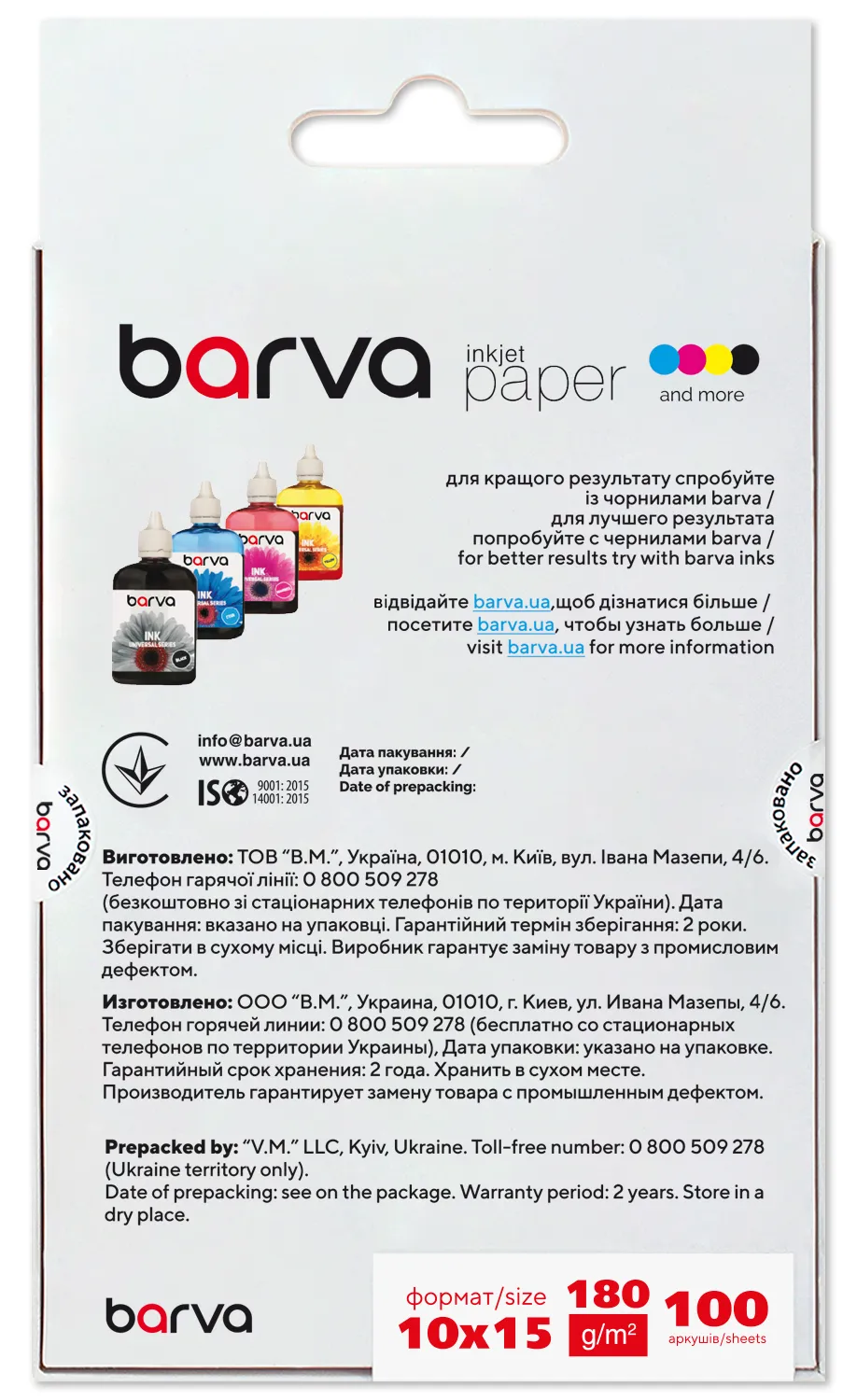 Під торговою маркою Barva на ринок виходить широкий асортимент матеріалів для струменевого друку, який допоможе Вам з виконанням різних завдань - від друку фотографій, до виготовлення рекламних і маркетингових матеріалів. Носії для струминного друку під цією торговою маркою випускаються на ринок українською компанією ТОВ «В. М. » з 2003 року і вже встигли завоювати довіру користувачів незмінно високою якістю та доступними цінами.
