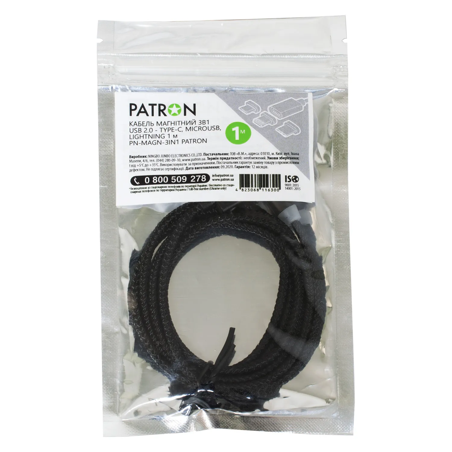 Кабель магнітний 3 в 1 USB 2.0 - Type-C, Micro USB, Lightning 1 м Patron (PN-MAGN-3IN1)