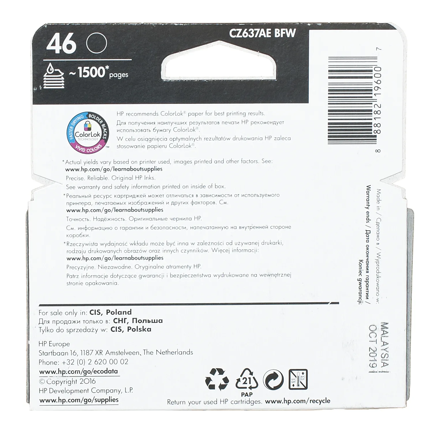 Картридж №46 Ultra Ink Advantage чорний HP (CZ637AE) опис: