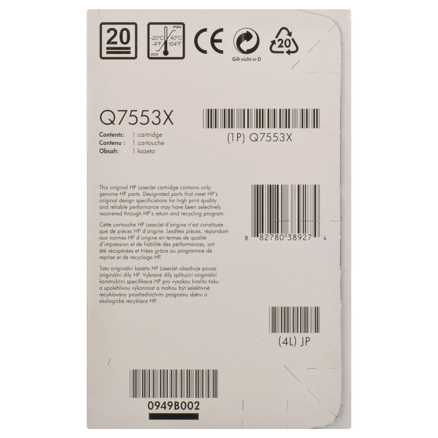 Оригінальний картридж Q7553X розроблений компанією HP, яка гарантує якісний друк протягом всього ресурсу - 7000 сторінок. Картридж 53X чорний HP (Q7553X) відноситься до групи оригінальних витратних матеріалів, єдиним мінусом яких є висока вартість.