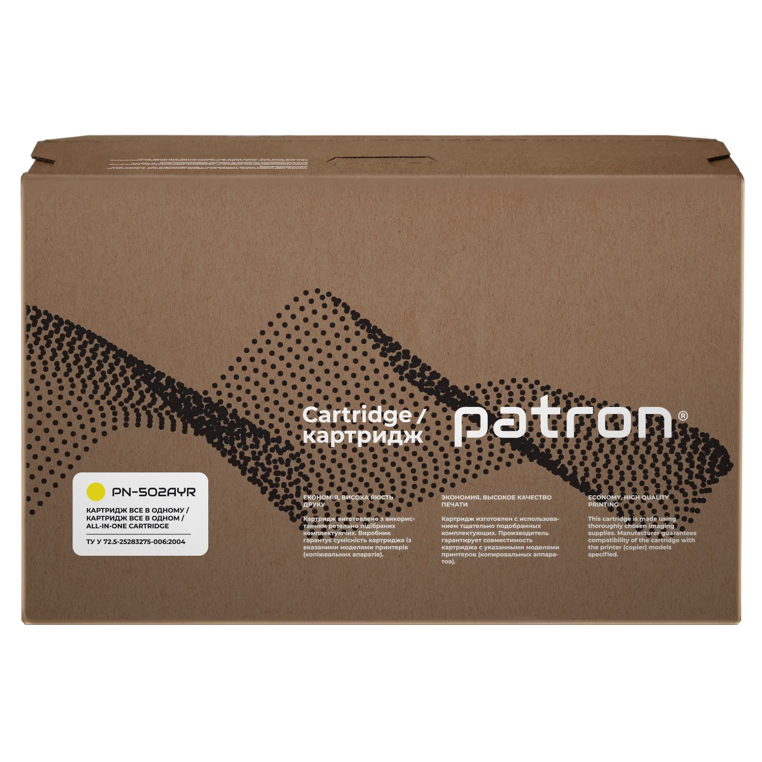 Висока оптична щільність відбитку протягом усього ресурсу картриджа досягається використанням якісних комплектуючих, тестування яких робиться у власній лабораторії контролю якості. При виробництві картриджів Patron Extra ми дотримуємось загального стандарту ISO 9001:2015 та спеціального стандарту, що використовуються в індустрії друку, - ISO 19752:2017 для монохромних картриджів, ISO 19798:2017 - для кольорових картриджів, а також STMC стандарт для контролю ресурсу.