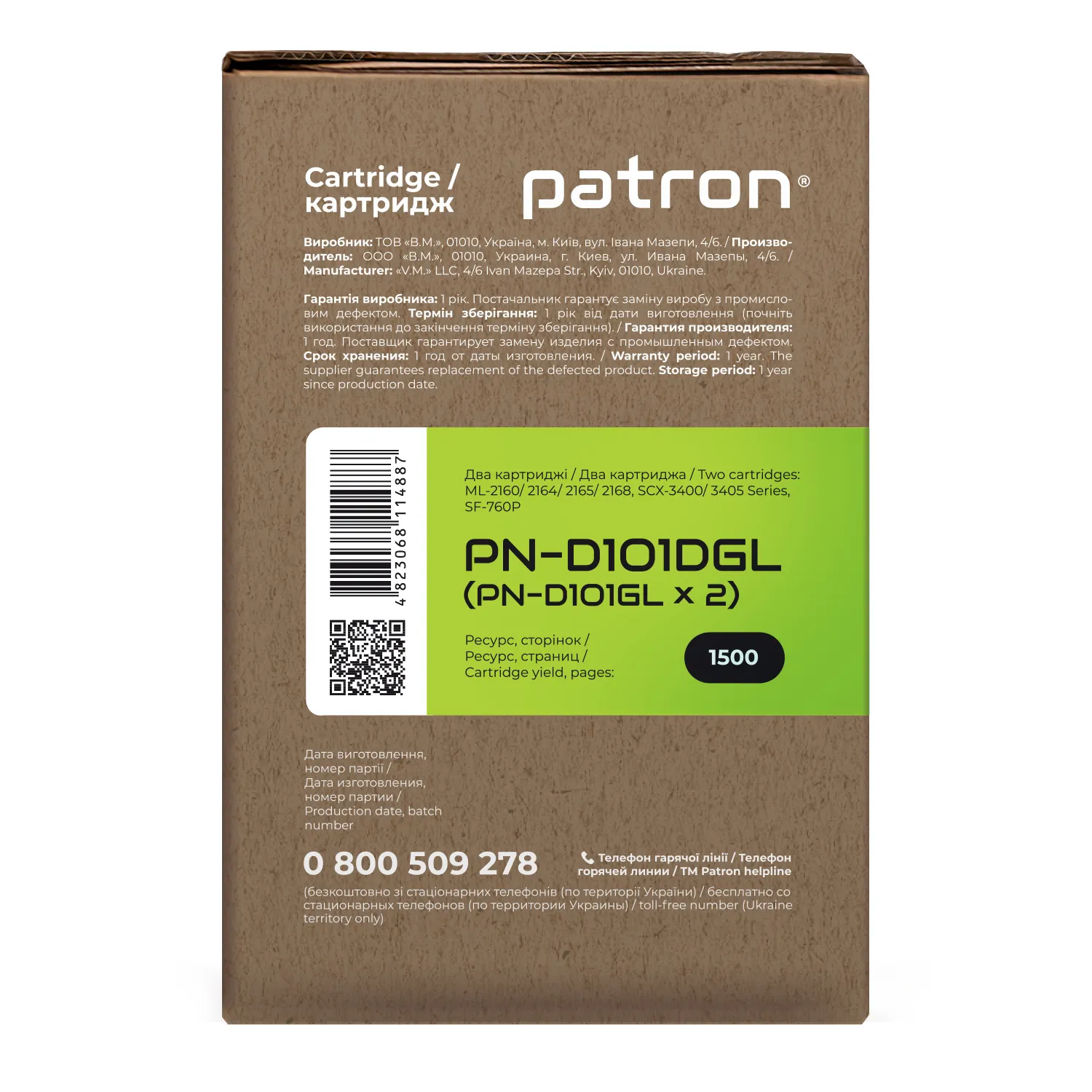 Ми потурбувалися про те, щоб упаковка картриджа була не лише екологічною, функціональною, мала мінімально можливі фізичні розміри, але і містила усю необхідну інформацію. На зеленій етикетці знаходиться інформація про картридж, його сумісність з друкувальними пристроями, номер партії, дата виготовлення, контакти виробника, а також номер телефону безкоштовної гарячої лінії для українських споживачів.