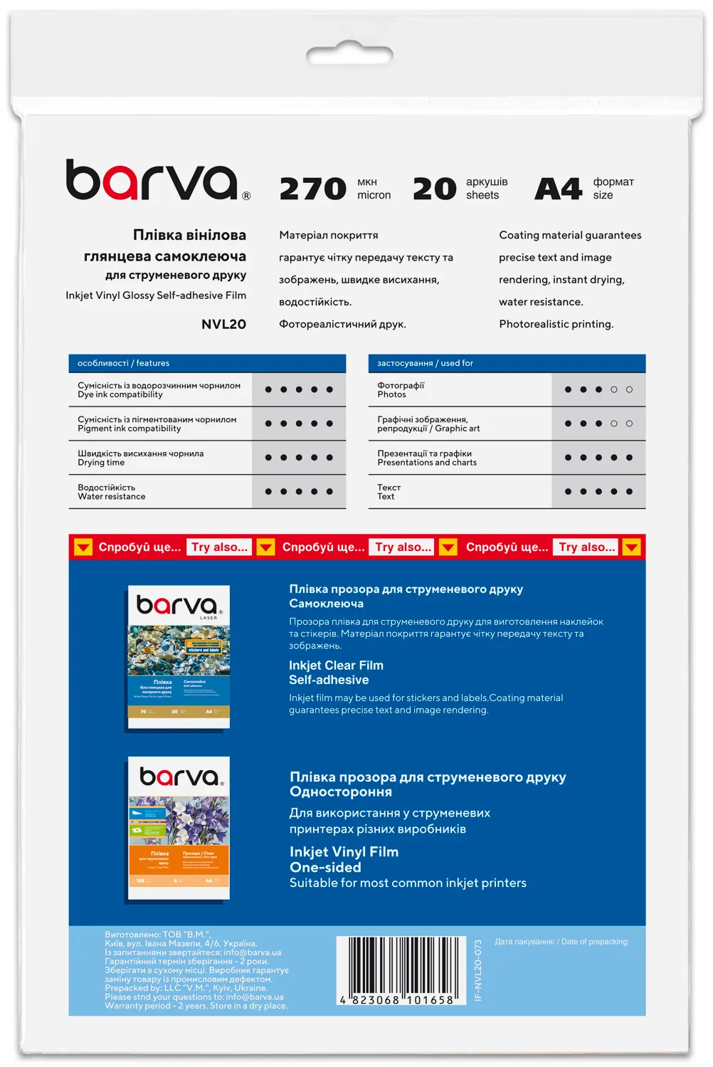 Ви можете купити Плівка самоклеюча для струменевого друку 270 мкм, A4, 20 арк, вінілова, глянцева, біла Barva (IF-NVL20-073) в нашому інтернет-магазині з доставкою по Києву та всій Україні.