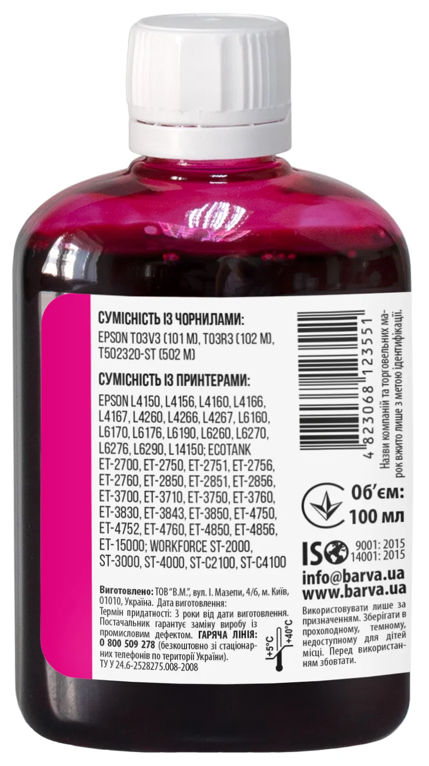 Украинская компания ООО «В.М.» занимается производством чернил под торговой маркой Barva уже много лет. На базе собственной лаборатории осуществляется как разработка новых формул, так и непрерывный контроль качества выпускаемой продукции. При производстве чернил производитель следует стандартам ISO 9001:2015 и ISO 14001:2015.