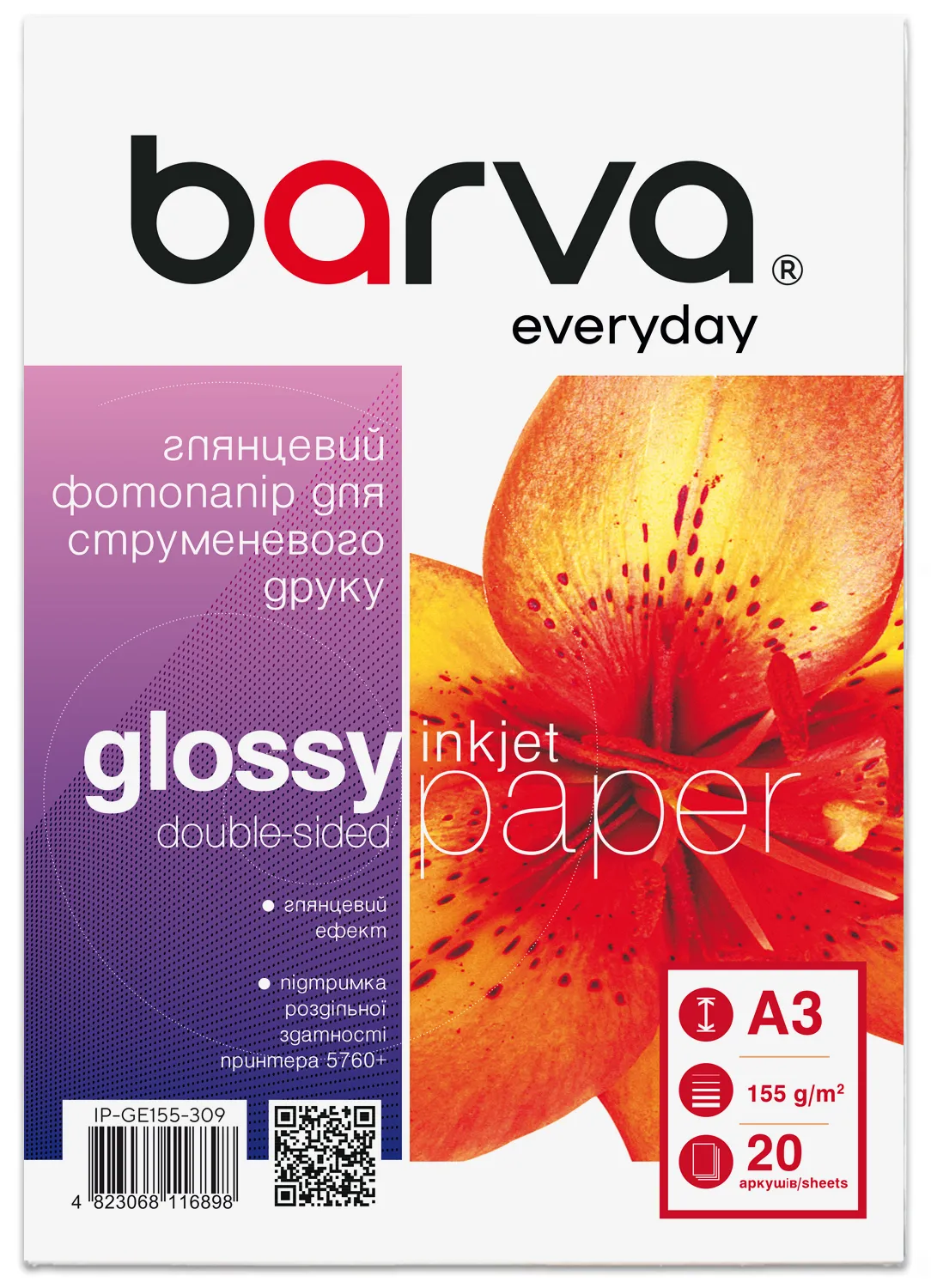 Фотобумага глянцевая двусторонняя 155 г/м2, A3, 20 л Everyday Barva (IP-GE155-309) - гарантия качества