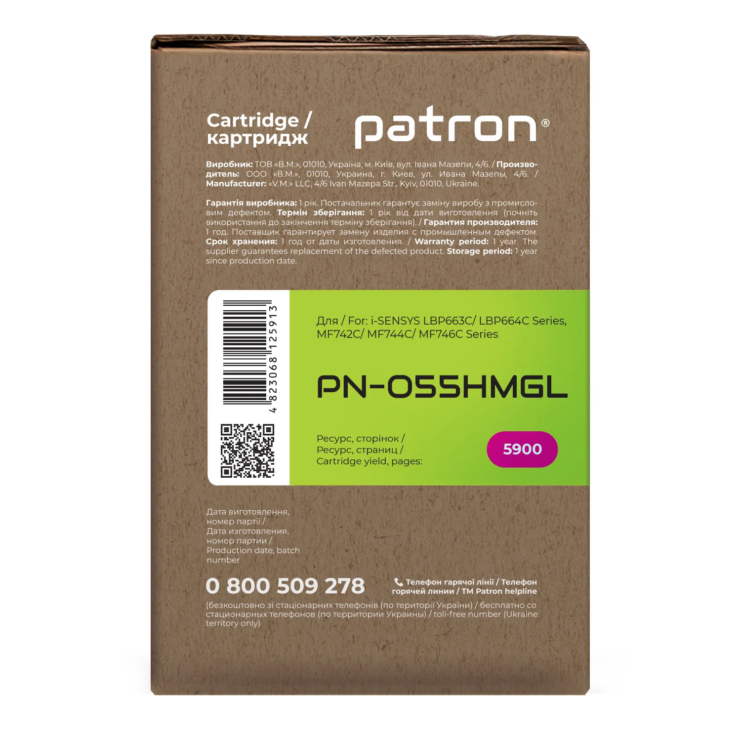 Мы позаботились о том, чтобы упаковка картриджа была не только экологичной, функциональной, имела минимально возможные физические размеры, но и содержала всю необходимую информацию. На зеленой этикетке находится информация о продукте, его совместимости с печатающими устройствами, номер партии, дата изготовления, контакты производителя, а также номер телефона бесплатной горячей линии для украинских потребителей.