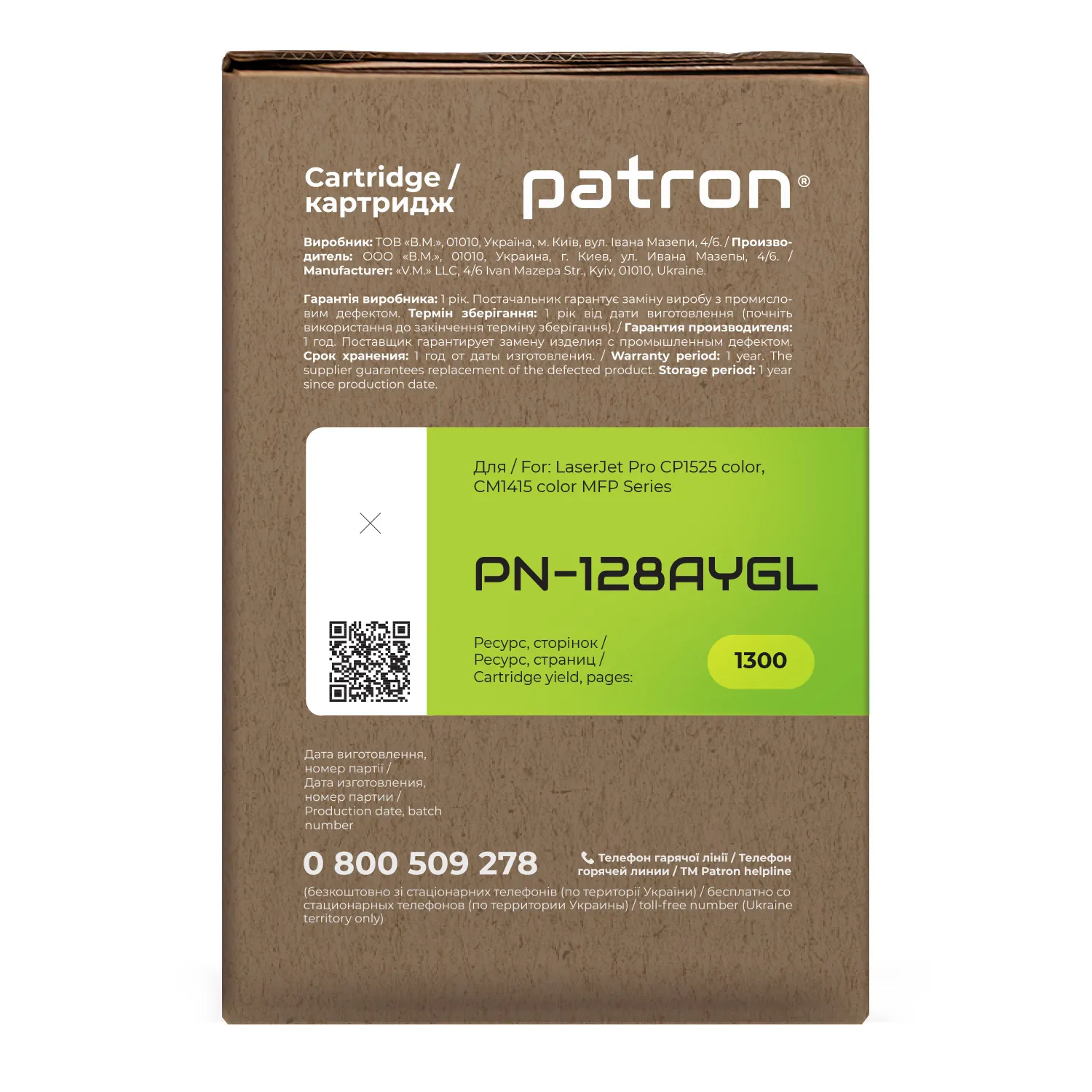 Мы позаботились о том, чтобы упаковка картриджа была не только экологичной, функциональной, имела минимально возможные физические размеры, но и содержала всю необходимую информацию. На зеленой этикетке находится информация о продукте, его совместимости с печатающими устройствами, номер партии, дата изготовления, контакты производителя, а также номер телефона бесплатной горячей линии для украинских потребителей.