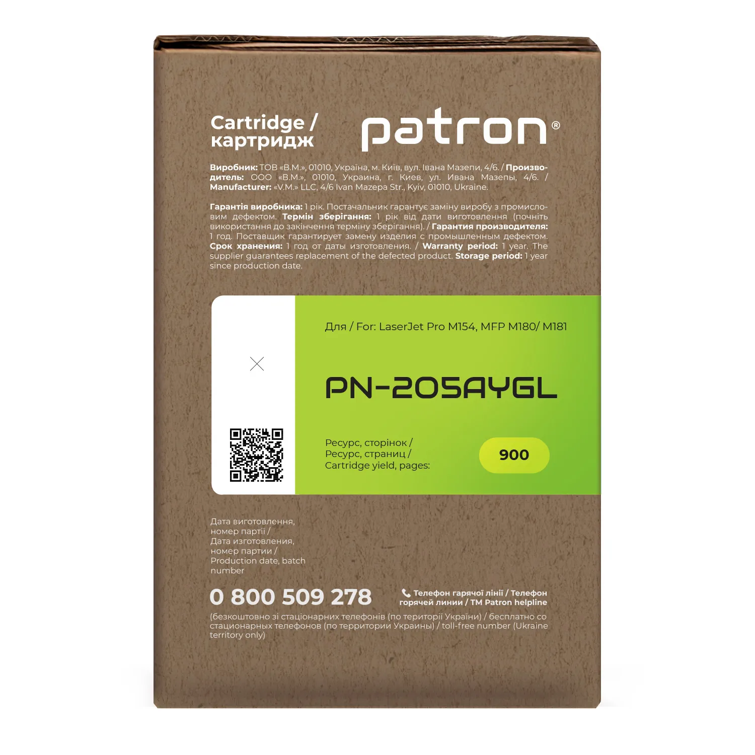 Мы позаботились о том, чтобы упаковка картриджа была не только экологичной, функциональной, имела минимально возможные физические размеры, но и содержала всю необходимую информацию. На зеленой этикетке находится информация о продукте, его совместимости с печатающими устройствами, номер партии, дата изготовления, контакты производителя, а также номер телефона бесплатной горячей линии для украинских потребителей.