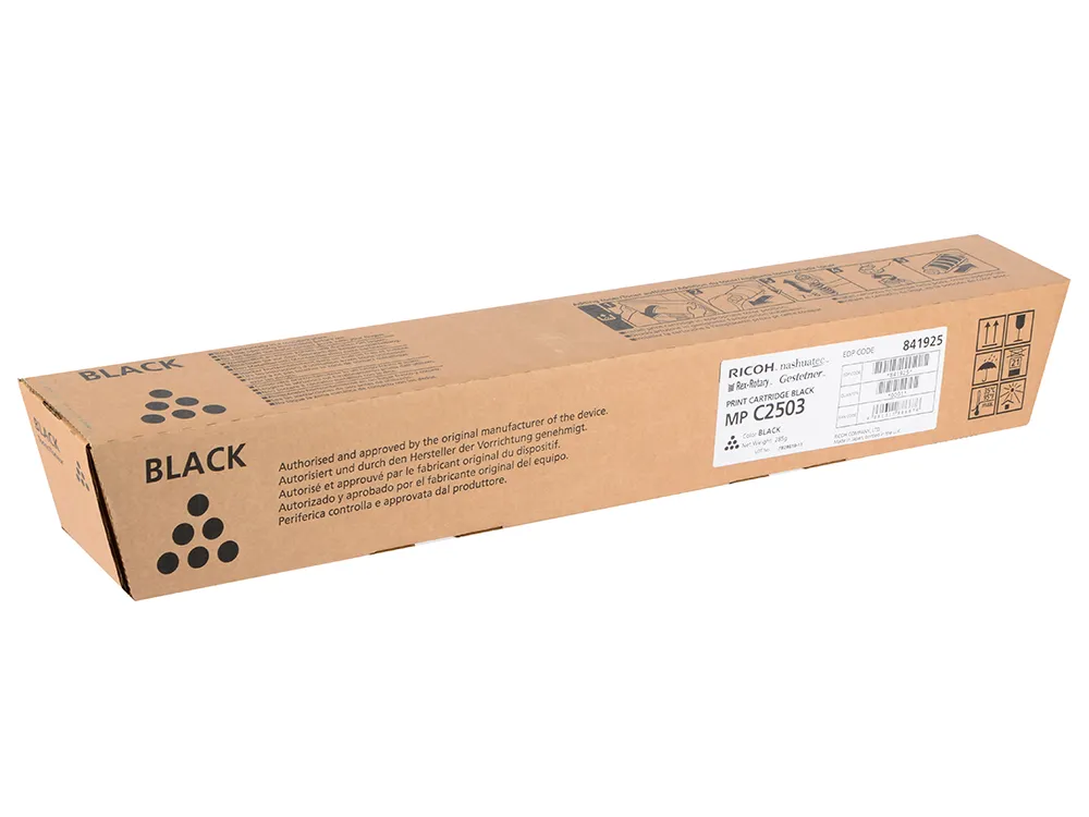 Тонер - картридж 2503-B розроблений та виробляється компанією Ricoh, тому він є ідеальним вибором для бездоганної якості друку. Можна із впевненістю розраховувати, що оригінальний картридж для лазерного принтера Ricoh буде безвідмовно працювати протягом всього ресурсу – 15000 сторінок. Тонер-картридж MPC2503 чорний Ricoh (841925) відноситься до групи оригінальних витратних матеріалів, єдиним мінусом яких є висока вартість.